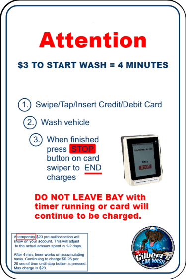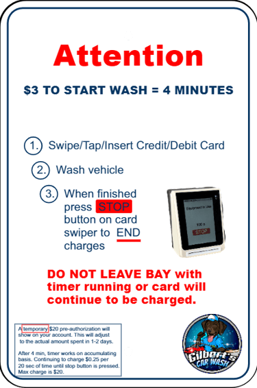 When paying via Credit Card, we utilize a timer that works on an accumulating basis. This gives you 4 minutes 45 seconds of wash time for $3.50. Time continues to count up after 4 minutes, unless the STOP button is pressed. When stop button is pressed, the Car wash is turned off.